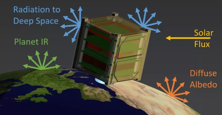其次,對于近地軌道上的衛(wèi)星,入射到地球日光側(cè)的太陽光通量會被漫反射到衛(wèi)星朝向地球一側(cè)的表面。這些反射的大小取決于地球的局部表面特性以及不斷變化的大氣條件??偟膩碚f,漫反射太陽光通量大約是直接太陽光通量的三分之一,被稱為反照率通量。當衛(wèi)星進入日食時,這些直接的太陽光通量和反照率載荷下降為零,但有一個第三環(huán)境熱源始終存在。地球是溫暖的,相當于一個漫射器,其紅外輻射的大小是緯度和經(jīng)度的函數(shù)。知道這些隨時間變化的環(huán)境通量,以及它們在衛(wèi)星表面的分布,是計算衛(wèi)星溫度所需要的輸入,這涉及到求解固體部分的熱傳導(dǎo)和所有暴露表面的輻射。通常將這些環(huán)境通量分為兩個波段:太陽波段和環(huán)境波段。