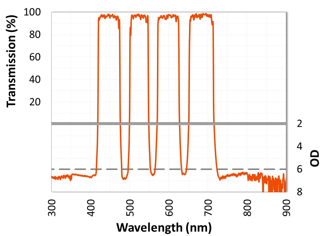 ULTRA系列多頻帶通濾光片可以設計為10個以上的透過波段,波段之間的OD值大于8,超高的截至陡度,高達98%的透過率。 它們非常適合用作熒光技術中的激發(fā)或發(fā)射濾光片,要求在單個樣本中同時檢測多個熒光團。