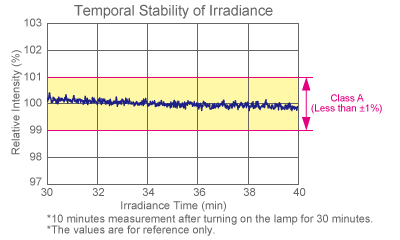![]() | 均勻性 在350-1800nm的范圍內(nèi),1太陽的計算值大約是94.4 mw/cm。 工作距離:大約220毫米可以通過光強度控制來調(diào)節(jié)由燈壽命引起的光強度下降。超過A類區(qū)域的大小是參考值。請注意,燈的輸出因制造批次而異。它需要分別檢查光強度。 |